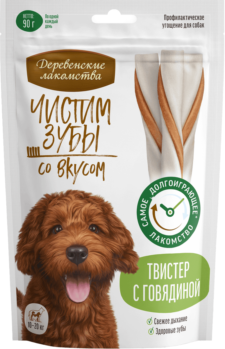Твистер с говядиной для собак средних пород - наше самое долгоиграющее лакомство. Эффективно удаляет зубной налет, предотвращая образование зубного камня. Мясная начинка приготовлена из отборных ингредиентов и не содержит искусственных консервантов и красителей.