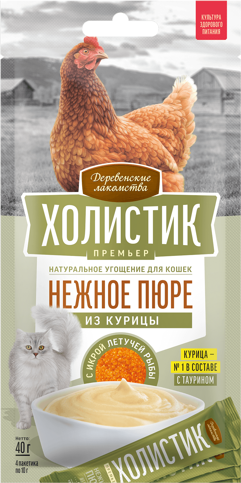 Изысканный десерт Деревенские Лакомства Холистик Премьер, нежнейшее пюре из отборного филе курицы с добавлением настоящего деликатеса - икры летучей рыбы.