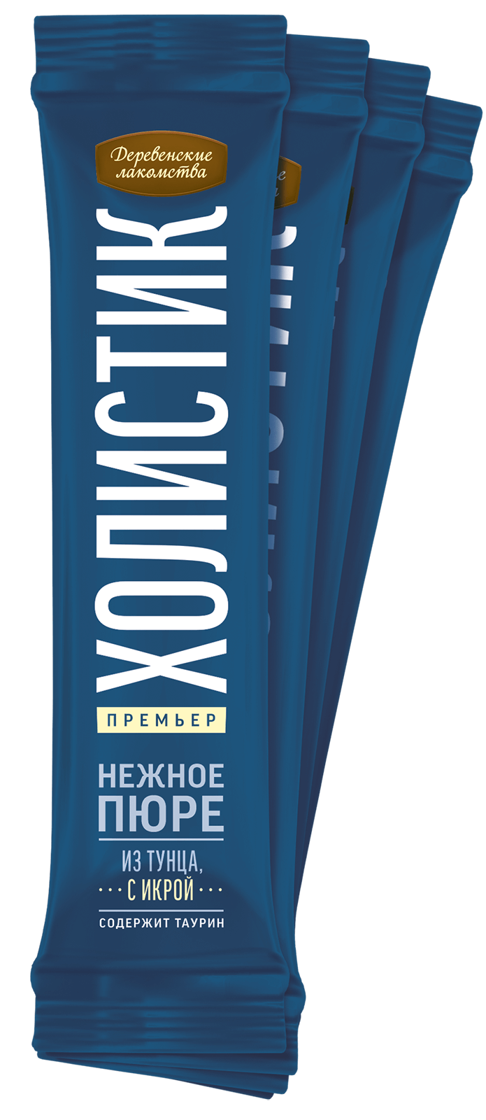 Изысканный десерт Деревенские Лакомства Холистик Премьер, нежнейшее пюре из отборного лосося с добавлением настоящего деликатеса - икры летучей рыбы.