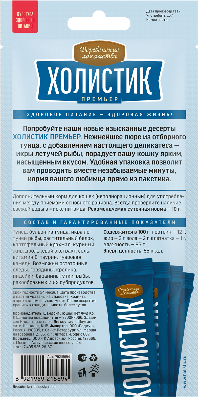Изысканный десерт Деревенские Лакомства Холистик Премьер, нежнейшее пюре из отборного тунца с добавлением настоящего деликатеса - икры летучей рыбы.