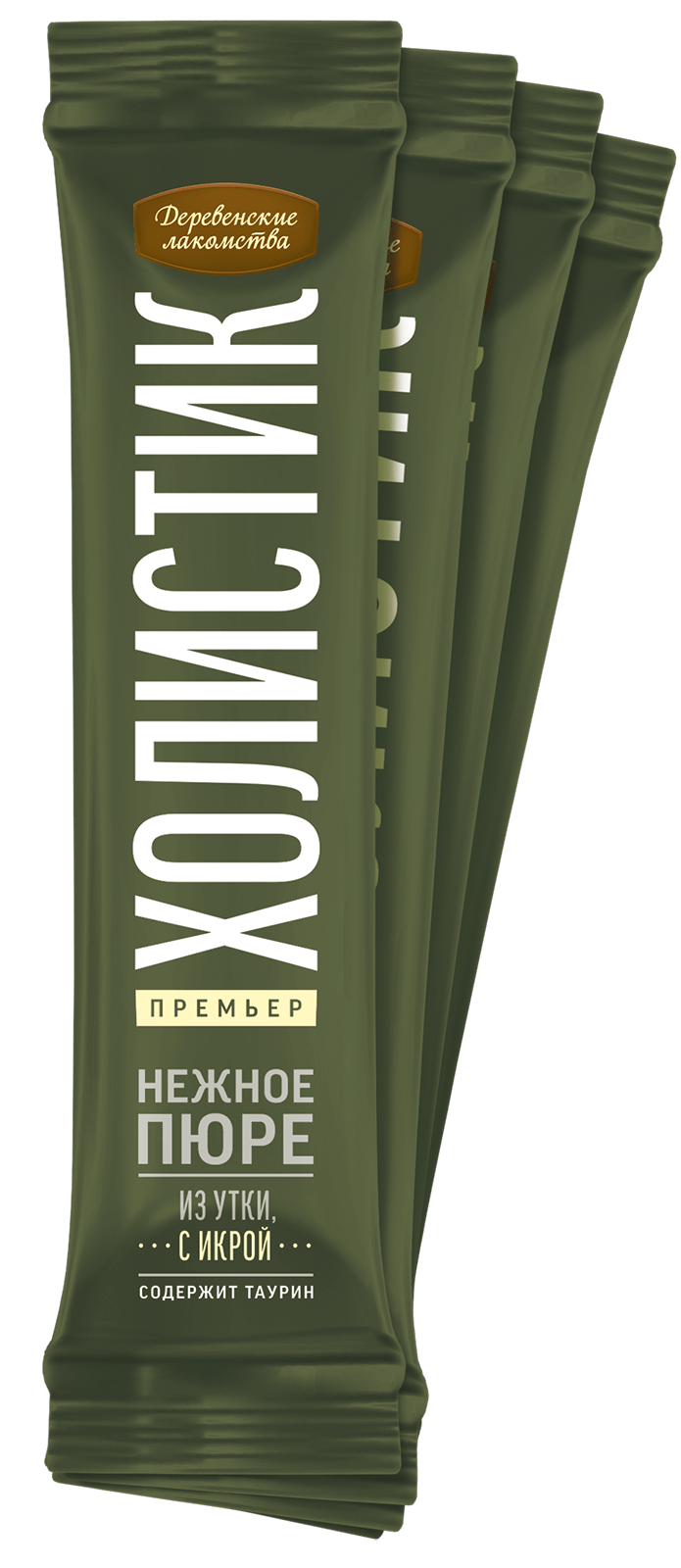 Изысканный десерт Деревенские Лакомства Холистик Премьер, нежнейшее пюре из отборного филе утки с добавлением настоящего деликатеса - икры летучей рыбы.