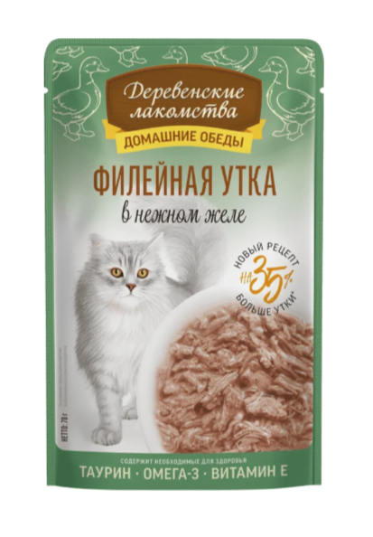 Консервированный влажный корм для кошек серии «Деревенские лакомства — Домашние обеды» — деликатес, созданный на основе отборного утиного филе, приготовленного на пару. Ваш пушистый гурман по достоинству оценит это высокое кулинарное искусство. Легкая текстура желе облегчает процесс потребления, делая этот продукт идеальным даже для самых привередливых питомцев.