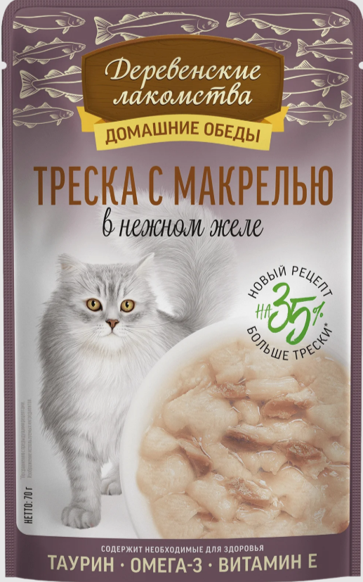 Консервированный влажный корм для кошек серии «Деревенские лакомства — Домашние обеды" — настоящее кулинарное наслаждение для вашей кошки. Откройте мир настоящего вкуса! Мы бережно объединили отборную треску и сочную макрель, создав уникальное сочетание, которое придется по душе даже самому искушенному ценителю. Приготовленные на пару кусочки рыбы сохранили все полезные вещества и насыщенный вкус, корм стал не только аппетитным, но и полезным. Легкое, воздушное желе придает блюду неповторимую текстуру и дополнительную сочность.