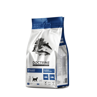При разработке суперпремиального рациона Doctrine для кошек и котов мы обратились к постулатам правильного питания. В нашей рецептуре соединились красная и белая рыба. Лосось поддерживает эндокринную и сердечно-сосудистую систему питомца, а тресковые породы благотворно влияют на нервную систему благодаря витамину В12. Богатый антиоксидантами шпинат дарит питомцу долголетие, а отсутствие зерна делает корм свободным от глютена и безопасным.