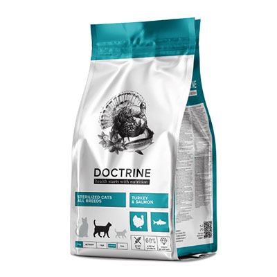 Беззерновой рацион Doctrine для стерилизованных кошек и кастрированных котов учитывает все особенности питомцев. Натуральная клюква стоит на страже здоровых почек, L-карнитин защищает от лишнего веса, шалфей дарит кошке гармонию в душе и крепкие нервы. Питательное мясо индейки содержит очень мало холестерина, а лосось обогащает организм незаменимыми жирными кислотами для здоровья сердца и сосудов вашего питомца, красивой кожи и шерсти.