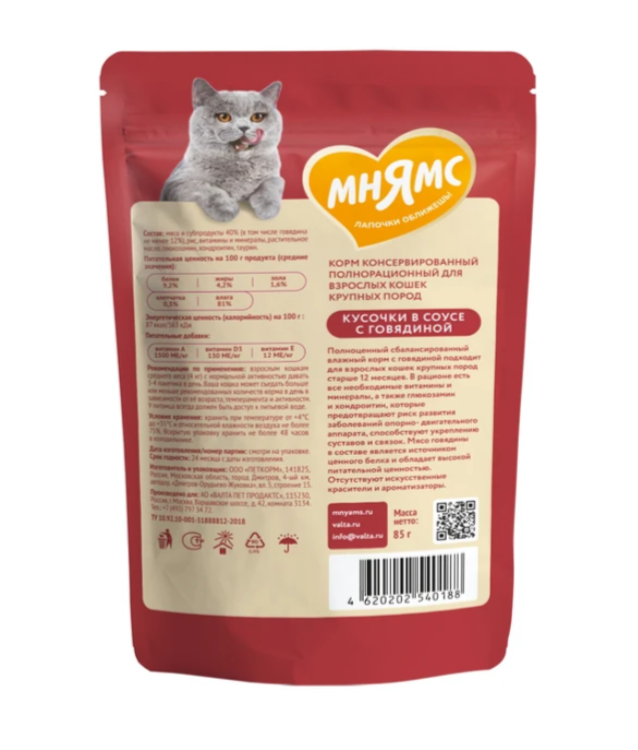 Высококачественный полнорационный сбалансированный влажный корм с говядиной подходит для взрослых кошек крупных пород старше 12 месяцев.